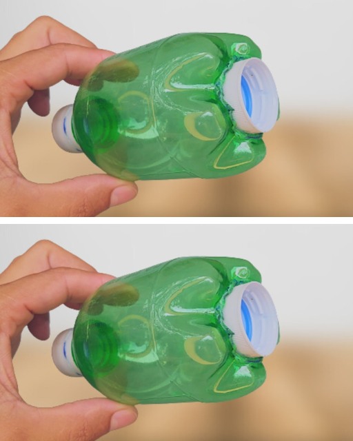 - Paso siguiente, una vez perforado y que hemos cortado el contorno de la parte superior (como lo muestra el vídeo), introducimos el pico de la botella y sellamos con la tapa de la botella quedando en la base de la botella.