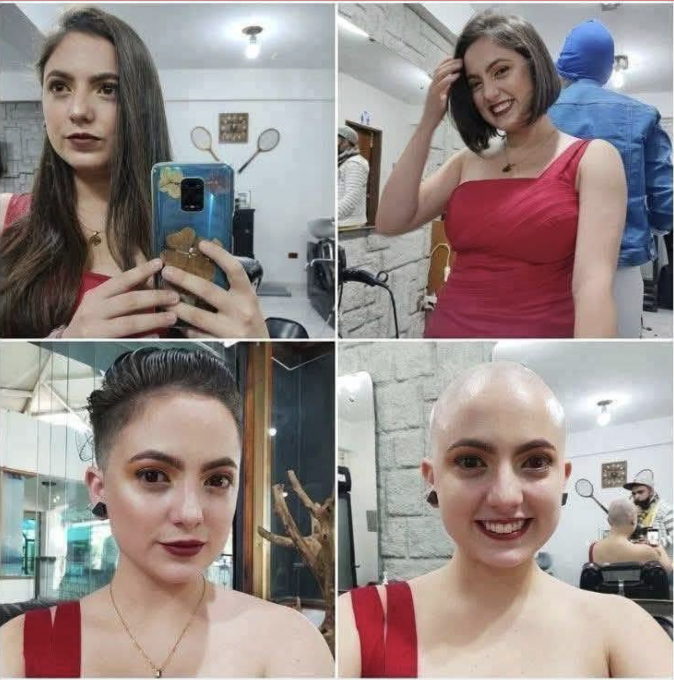 En la primera tengo mi cabello largo, en la segunda un corte más corto, en la tercera casi rapada, y en la última aparezco completamente calva, pero sonriendo. Esa sonrisa no es solo por un cambio de look. Es la sonrisa de alguien que acaba de terminar la quimioterapia.